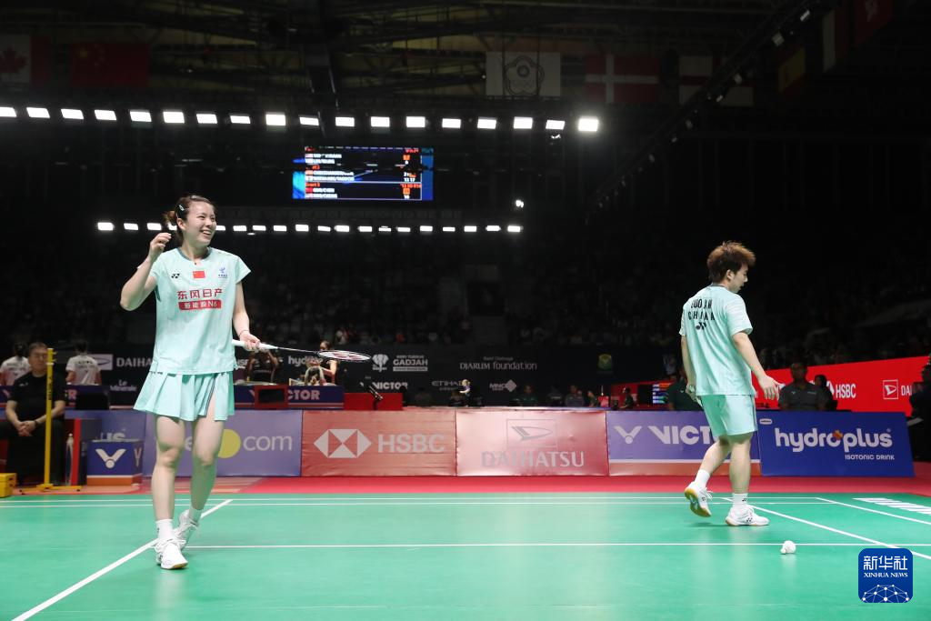 1月22日,郭新娃/陈芳卉(左)在比赛中庆祝得分。