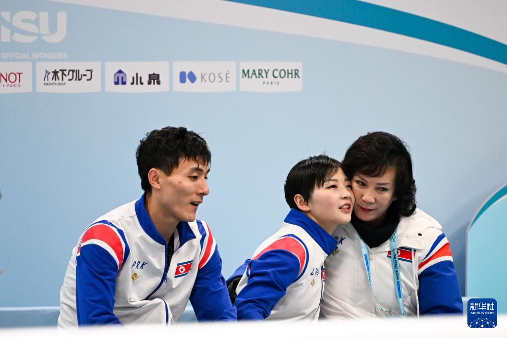 1月22日,朝鲜组合廉太钰(中)/韩锦澈(左)在双人滑短节目比赛后等候分数。