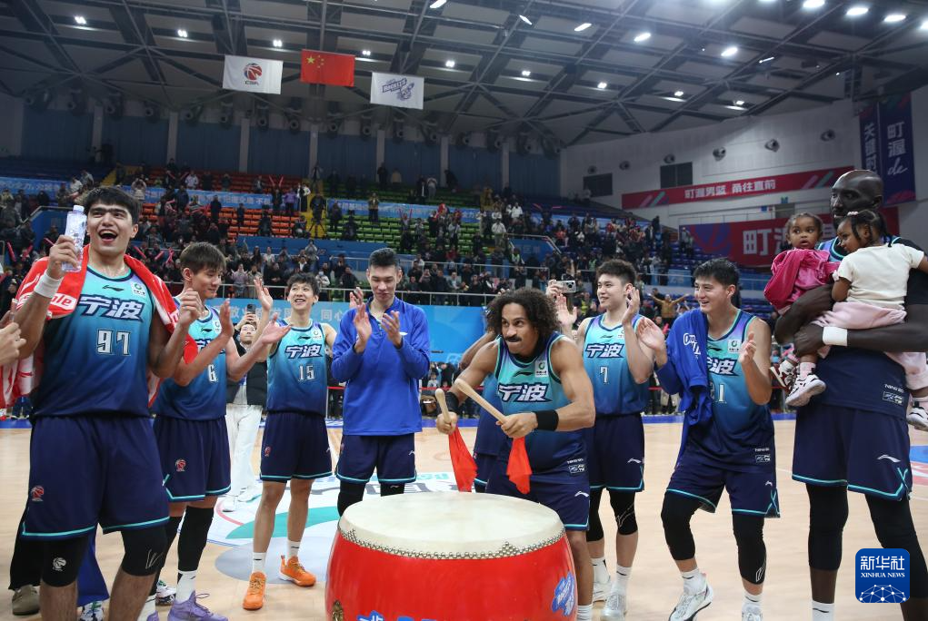 1月23日,宁波町渥队球员杰克逊(中)击鼓庆祝比赛胜利。