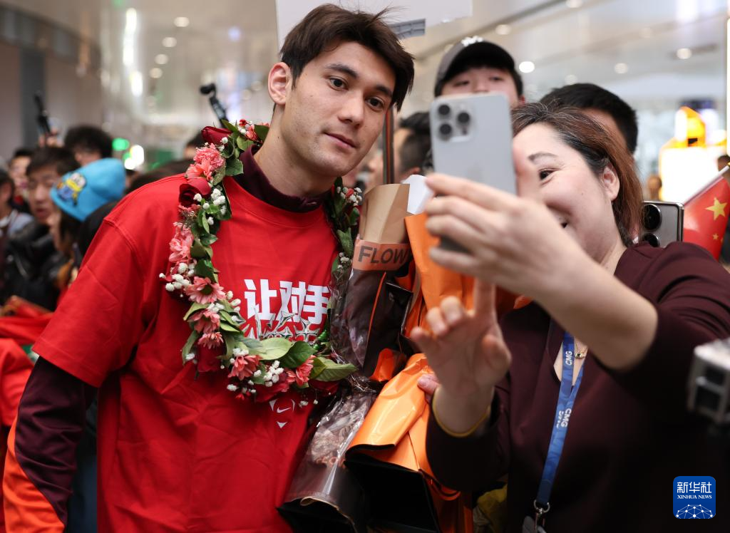 1月26日,中国队球员蒯纪闻(前)与球迷拥抱。