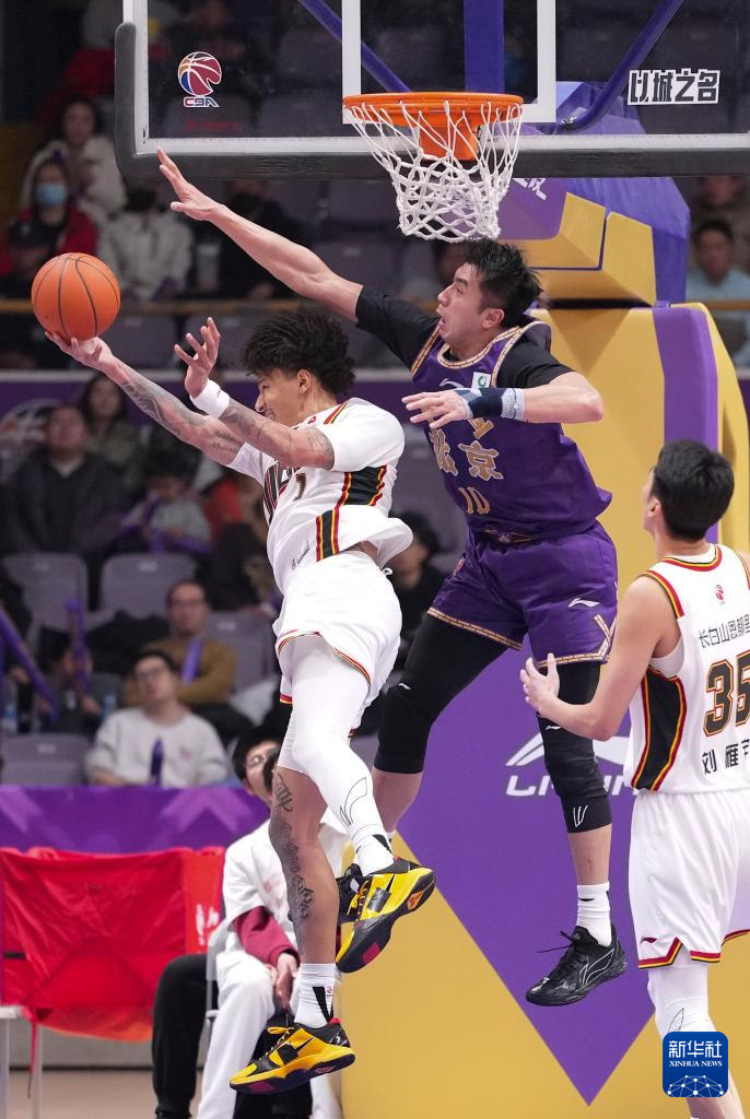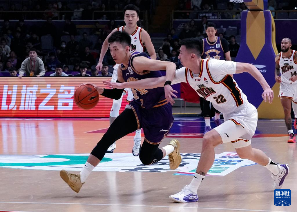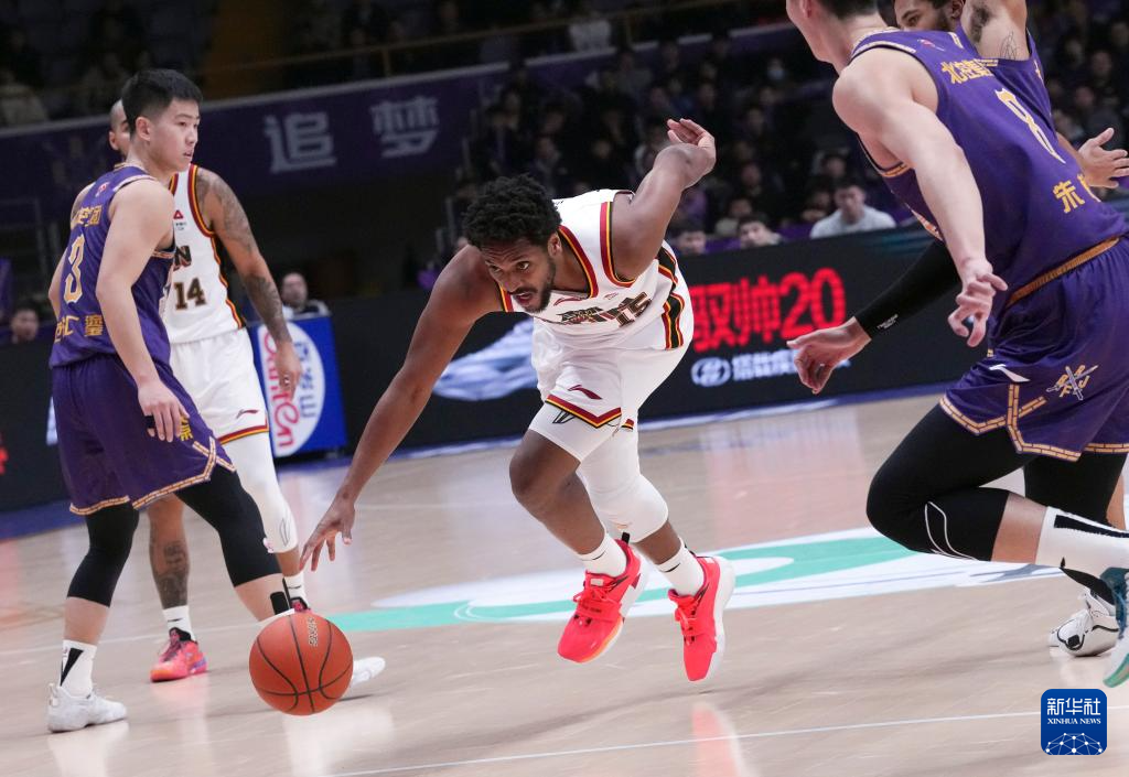 1月26日,北京控股队球员廖三宁(左一)在比赛中突破分球。