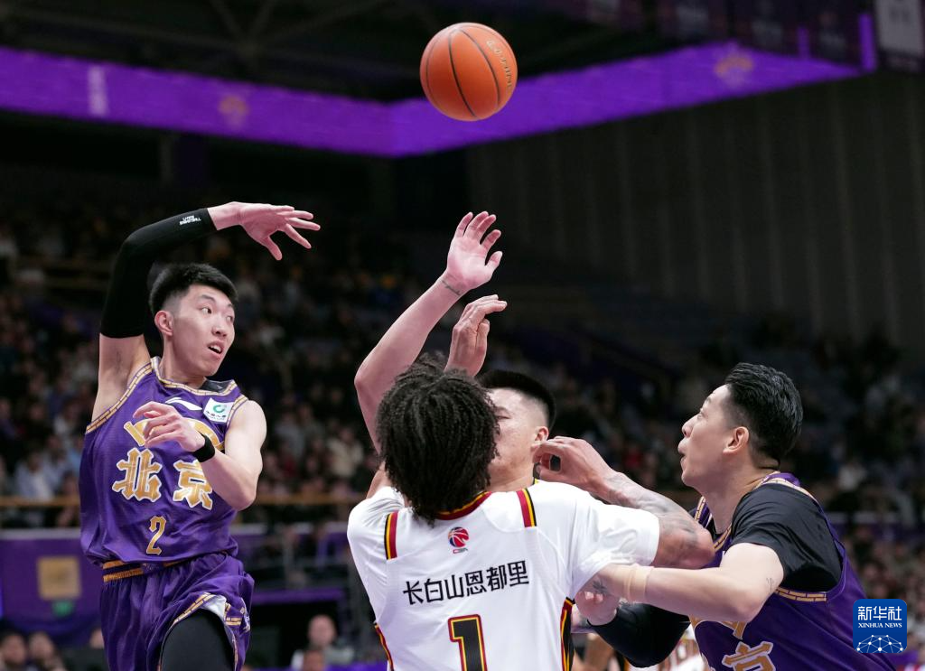 1月26日,北京控股队球员沈梓捷(左二)、邹雨宸(右一)和长白山恩都里队球员曾繁日(左一)在比赛中拼抢。