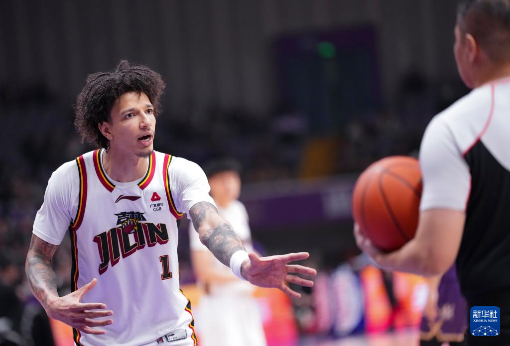 1月26日,长白山恩都里队球员威尔逊在比赛中与裁判沟通。
