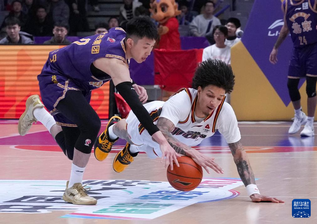 1月26日,长白山恩都里队球员贾昊(右)在比赛中防守北京控股队球员廖三宁。