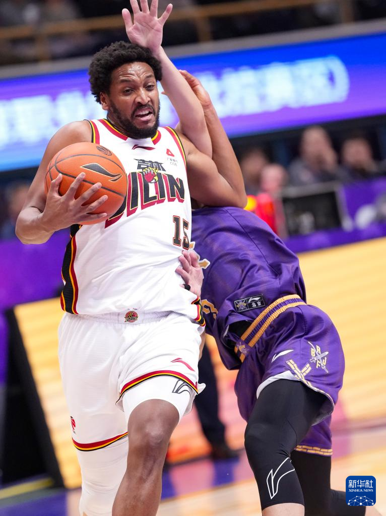 1月26日,长白山恩都里队球员盖利(左)在比赛中突破受阻。