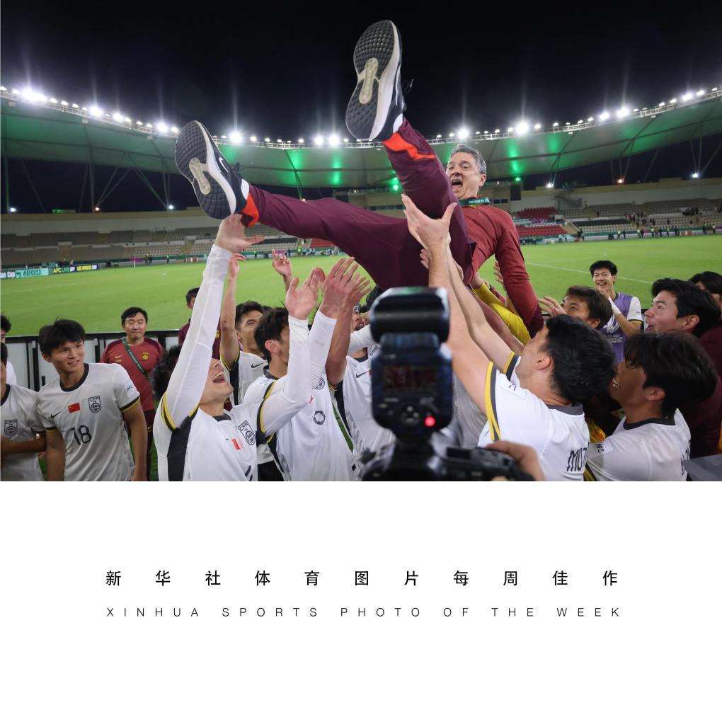 1月20日,中国队球员在比赛后抛起主教练安东尼奥·普切(上)庆祝。