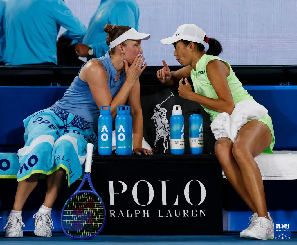 1月29日,张帅(右)/梅尔滕斯在比赛间隙交流。