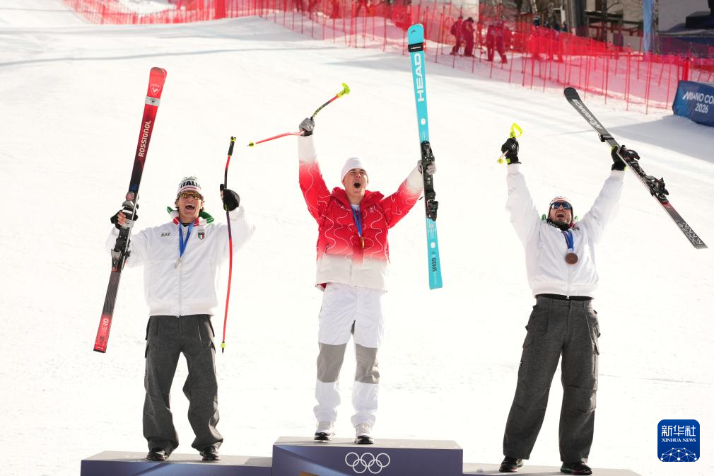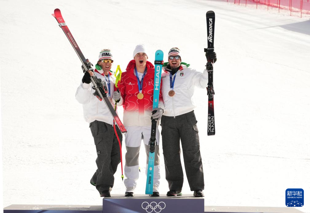 2月7日,冠军瑞士选手冯阿尔曼(中)、亚军意大利选手弗兰佐尼(左)、季军意大利选手帕里斯在颁奖仪式上。