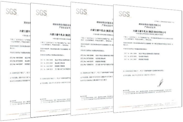 长期以来,蒙牛始终遵循“奶以安为要”理念,融合国际八大标准和全球最佳实践,构建起质量策划、质量控制、质量保障、质量支持“4Q”质量管理体系,实现“从牧草到餐桌”的全链条品质管控,将产品品质全面提升到世界一流水平。早在2021年,蒙牛旗下9大类产品全部达到欧盟标准,成为中国首个全品类通过食品欧盟标准产品认证的企业。