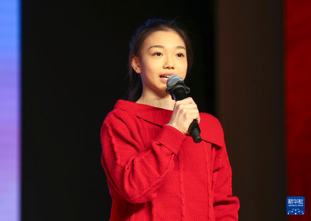 2月11日,国家体操队队员张可欣在联欢会上演唱歌曲。