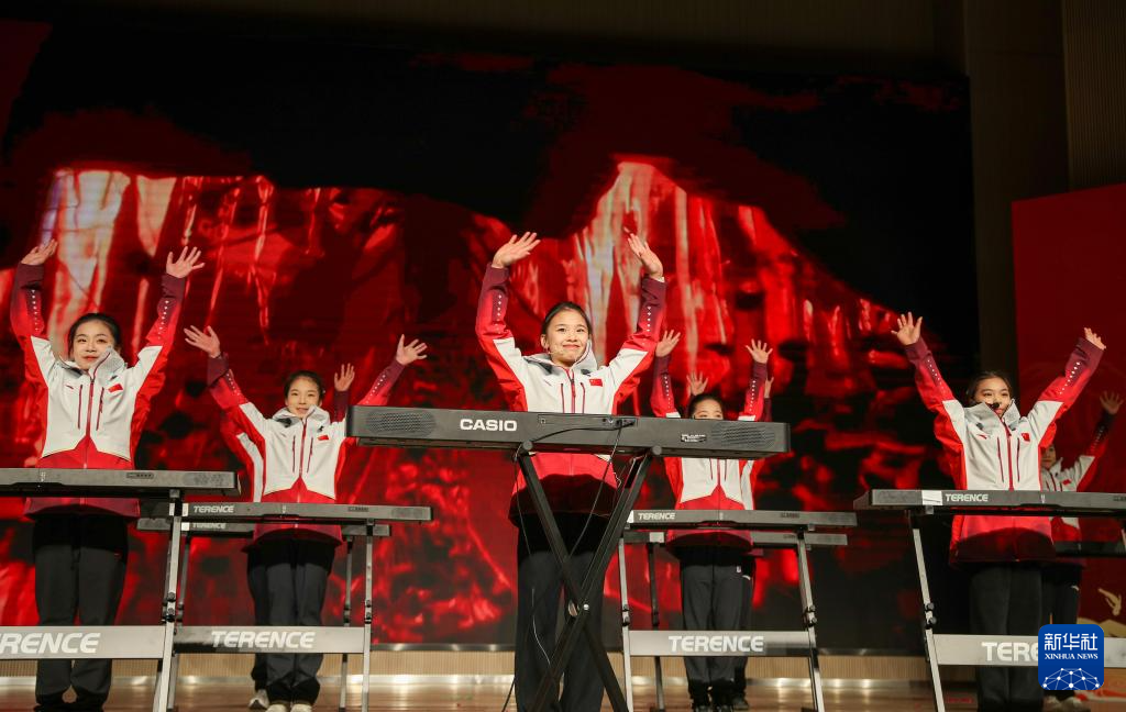 2月11日,国家体操队队员在联欢会上演奏电子琴。