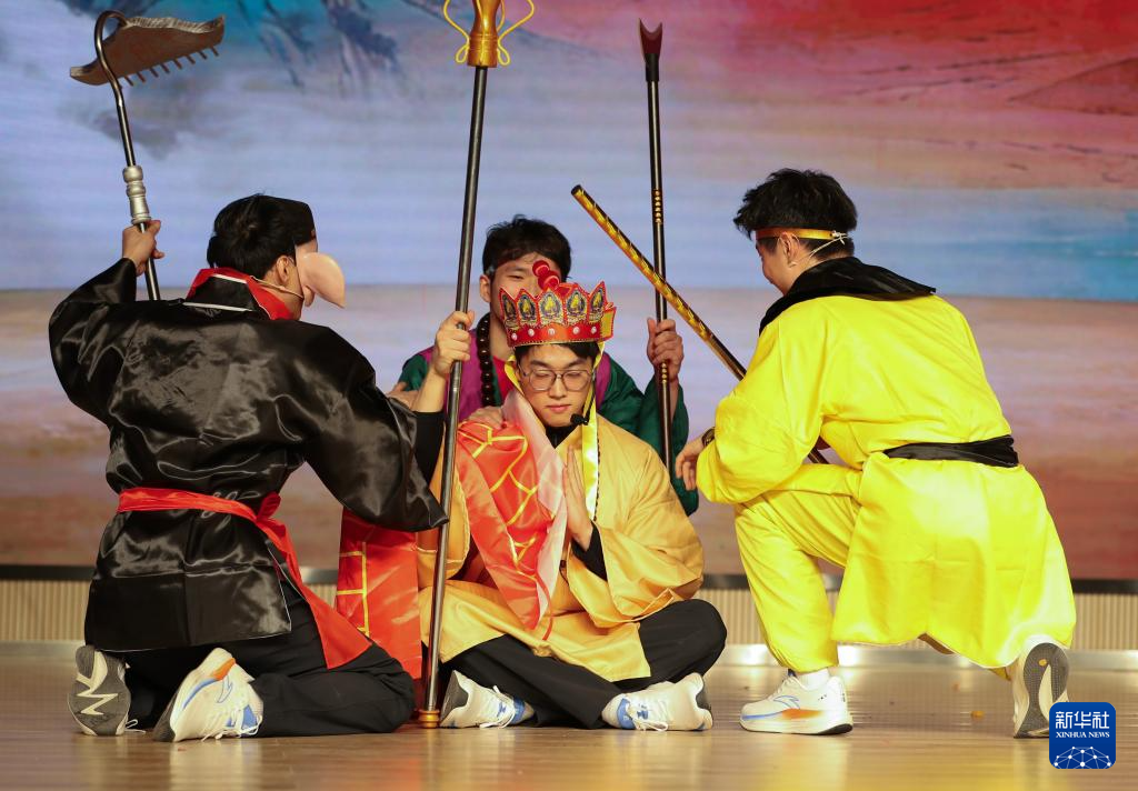 2月11日,国家体操队队员杜思雨、田倬凡、张欣怡、张清颖(从左至右)在联欢会上表演小品。