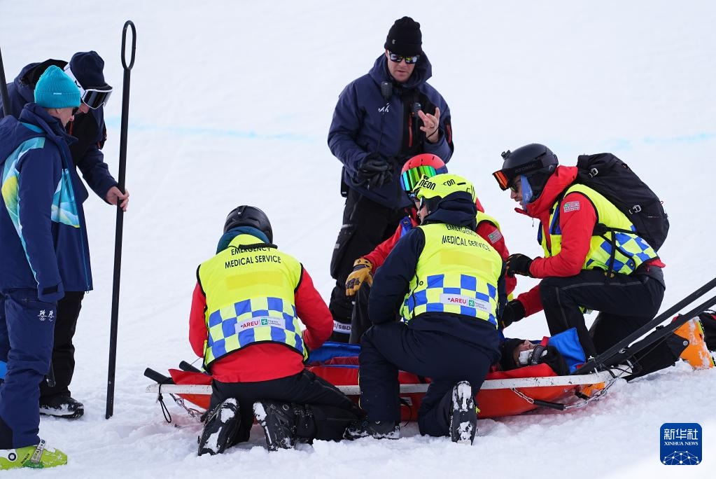 2月11日,中国选手刘佳宇摔倒受伤后,医务人员第一时间进场检查。
