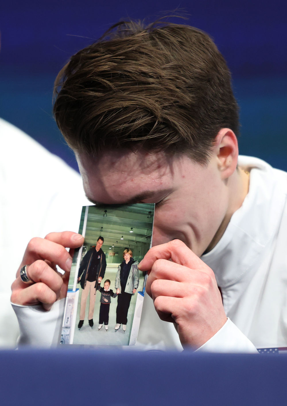 2月10日,美国选手马克西姆·瑙莫夫在花样滑冰男子单人滑短节目比赛后手持与父母的合影。新华社记者 李明 摄