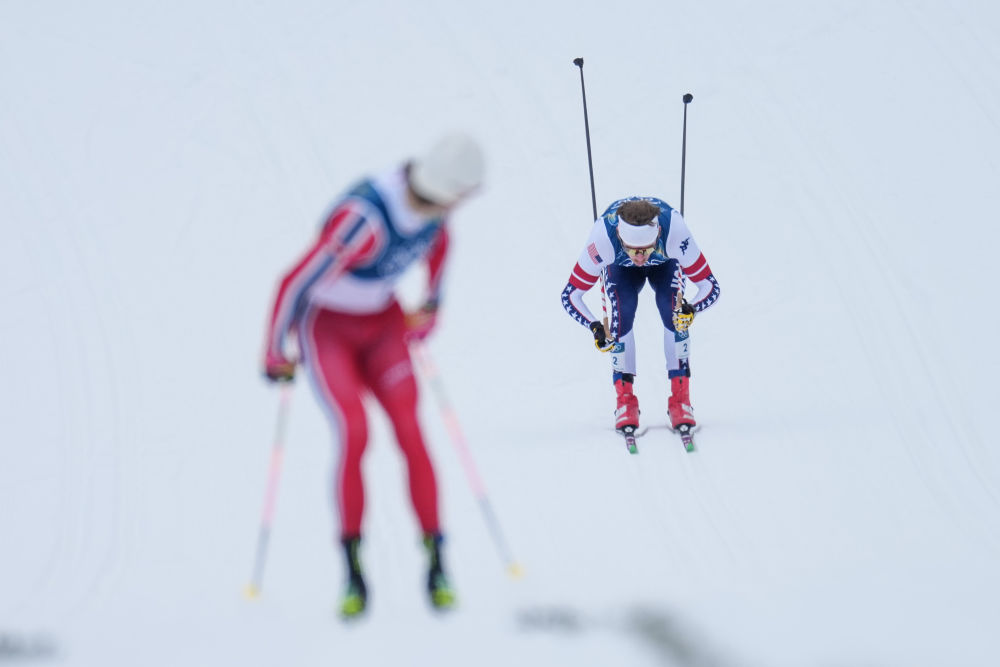 2月10日,获得越野滑雪男子个人短距离(传统技术)冠军的挪威选手克莱博(前)在冲线前回看身后的运动员。新华社记者 彭子洋 摄