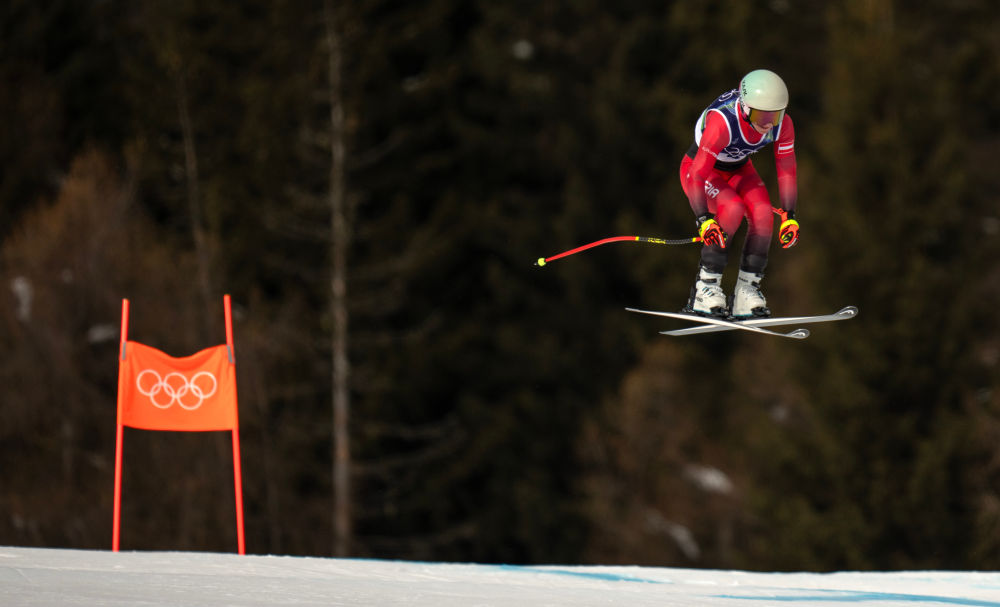 2月10日,奥地利选手阿丽亚娜·雷德勒在高山滑雪女子团体全能滑降比赛中。新华社记者 费茂华 摄