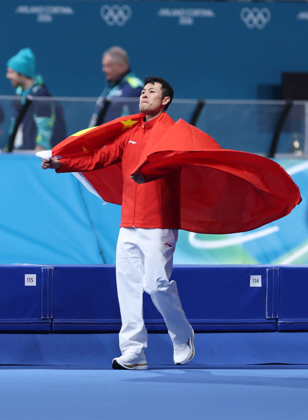 2月11日,季军宁忠岩在速度滑冰男子1000米决赛后身披国旗庆祝。新华社记者 杜潇逸 摄