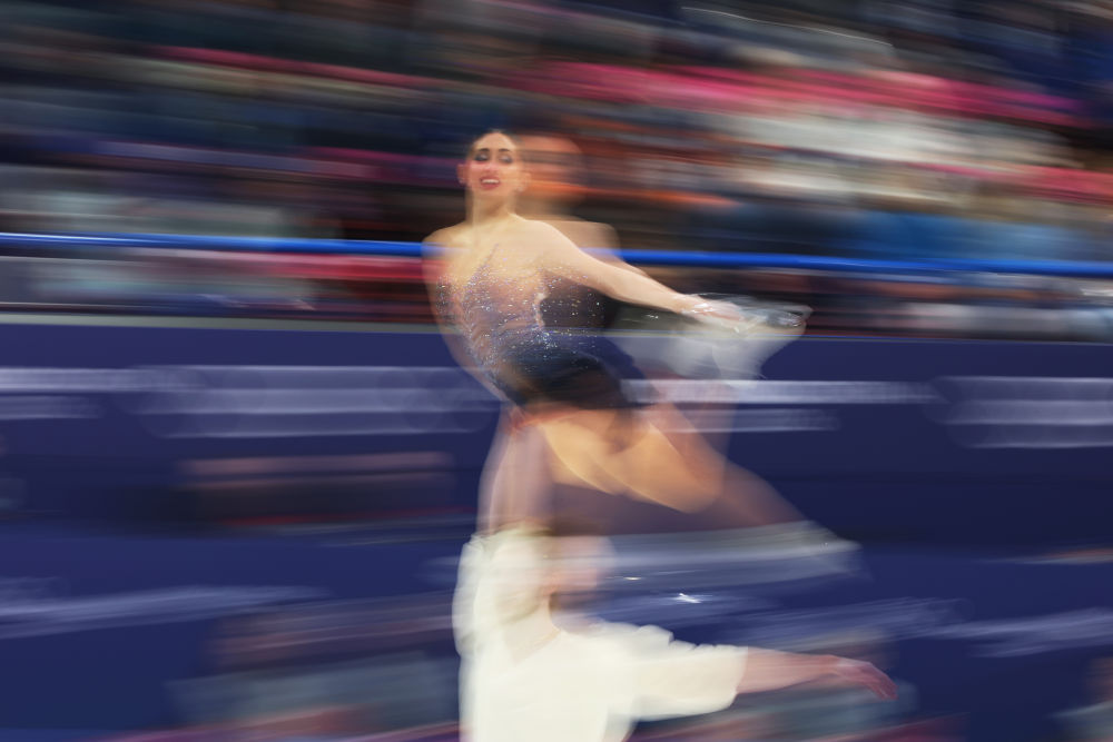 2月11日,美国组合乔克(上)/贝茨在花样滑冰项目冰上舞蹈自由舞比赛中。新华社记者 程敏 摄