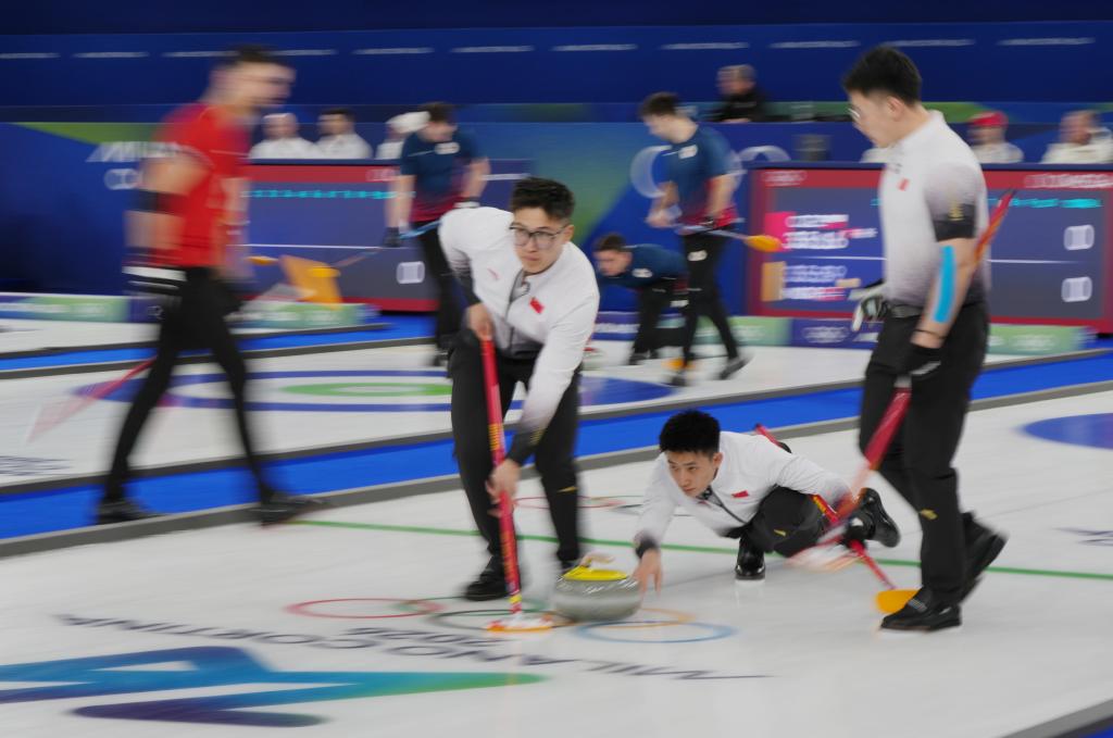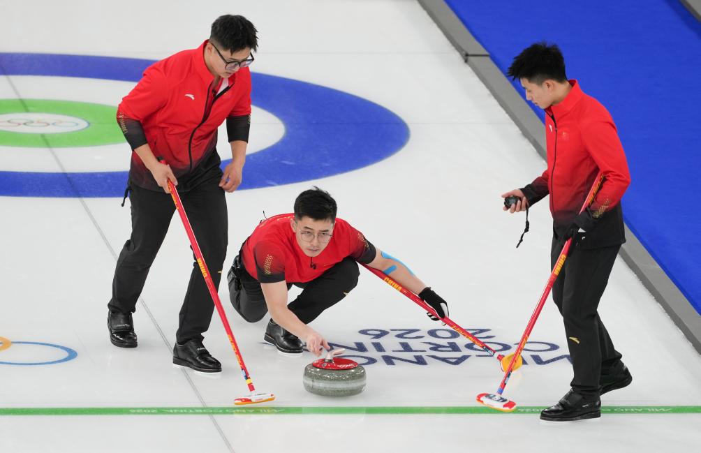 2月13日,中国队选手费学清(中)在比赛中掷壶。新华社记者 李钢 摄