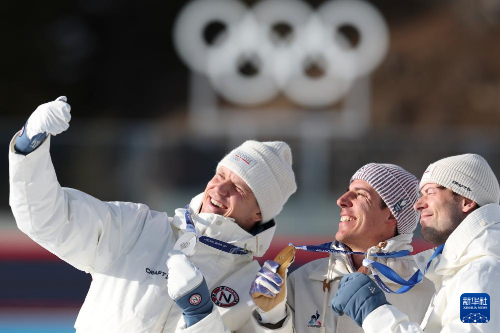 2月13日,亚军挪威选手韦特勒·肖斯塔·克里斯蒂安森、冠军法国选手康坦·菲永·马耶、挪威选手斯图拉·霍尔姆·莱格雷德(从左至右)在颁奖仪式上自拍。