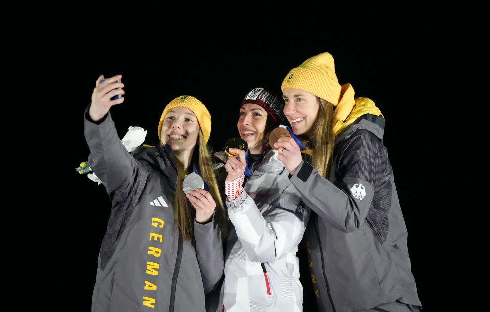 2月14日,冠军奥地利选手弗洛克(中)、亚军德国选手克雷尔(左)、季军德国选手普费弗在颁奖仪式上自拍合影。新华社记者 李钢 摄