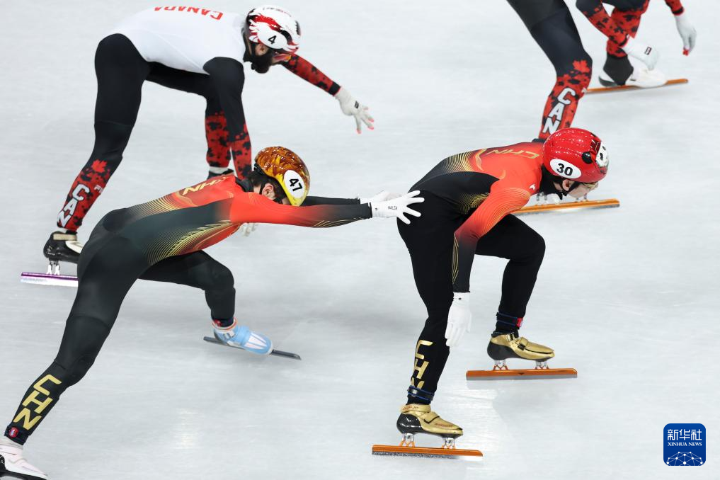 2月16日,中国队选手刘少昂(左二)、李文龙(左五)在比赛中。
