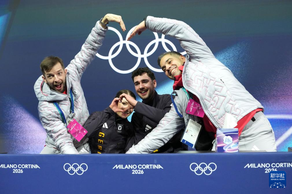 2月16日,德国组合安妮卡·霍克(左二)/罗伯特·昆科尔(右二)在比赛后等待成绩。