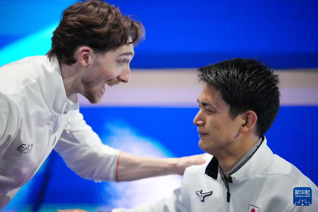 2月16日,日本选手木原龙一(右)在第三组自由滑比赛结束后接受意大利选手尼科洛的祝贺。最终,木原龙一与搭档三浦璃来获得双人滑项目冠军。