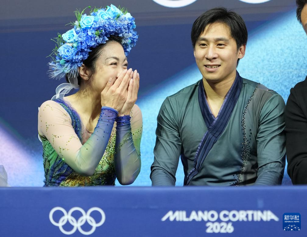 2月16日,日本组合三浦璃来(右)/木原龙一在双人滑自由滑比赛后。最终他们获得双人滑项目冠军。