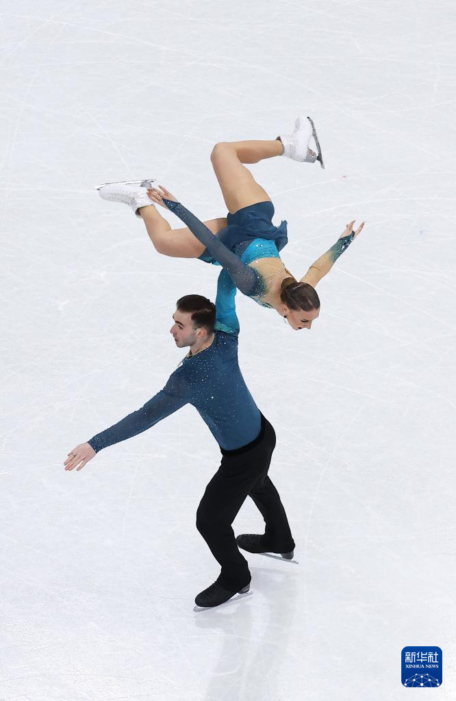 2月16日,格鲁吉亚组合梅特尔基娜/别鲁拉瓦(左)在双人滑自由滑比赛中。最终他们获得双人滑项目亚军。