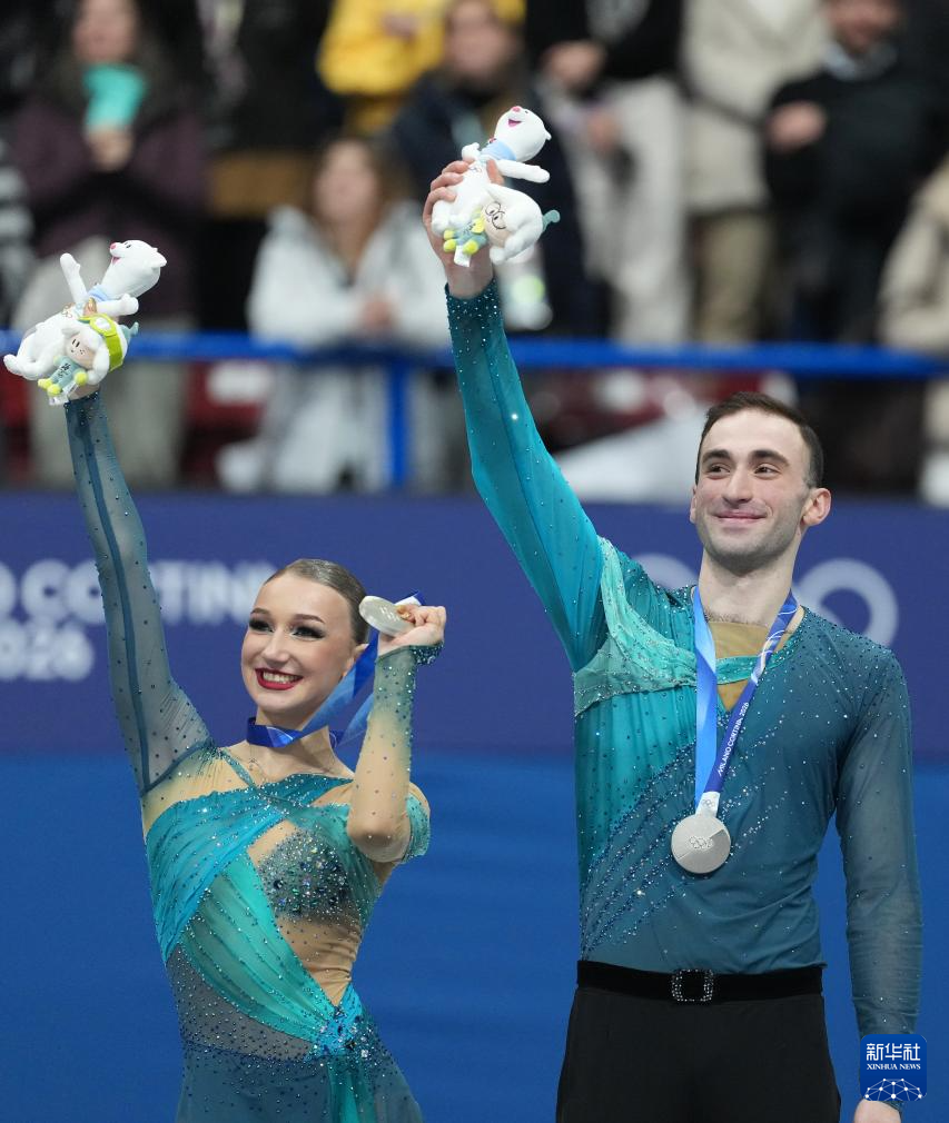2月16日,亚军格鲁吉亚组合梅特尔基娜(左)/别鲁拉瓦在双人滑颁奖仪式上向观众致意。