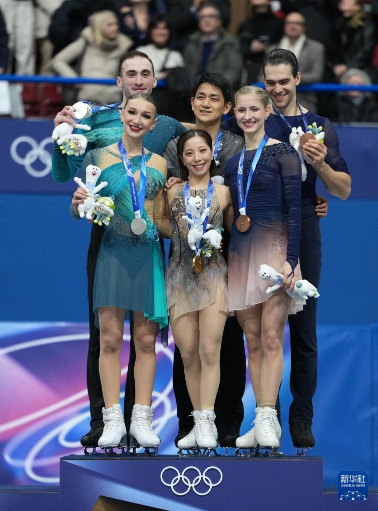 2月16日,冠军日本组合三浦璃来(前中)/木原龙一(后中),亚军格鲁吉亚组合梅特尔基娜(前左一)/别鲁拉瓦(后左一)和季军德国组合哈泽(前右一)/沃洛丁在双人滑颁奖仪式上。