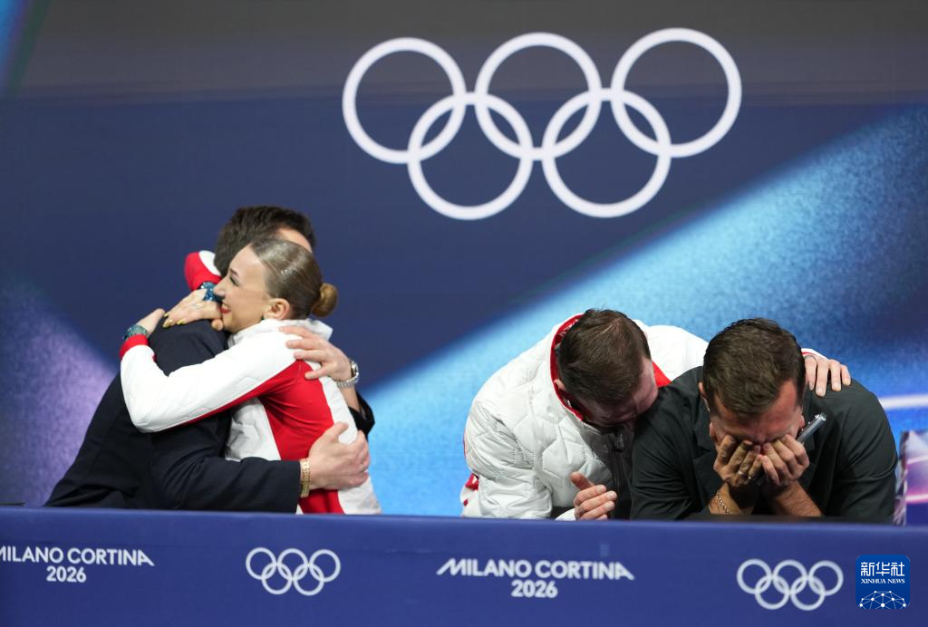 2月16日,格鲁吉亚组合梅特尔基娜/别鲁拉瓦在得知他们的成绩后与教练们相拥庆祝。最终他们获得双人滑项目亚军。
