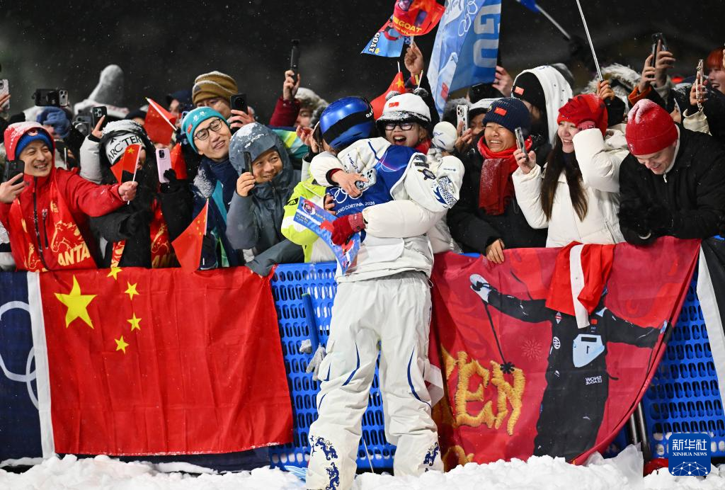 2月16日,中国选手谷爱凌(前)在第三跳后与观众拥抱。她获得亚军。