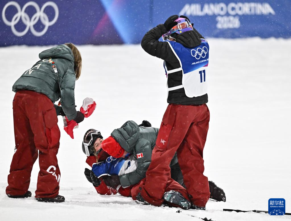 2月16日,加拿大选手梅根·奥尔德姆(下)在比赛后与队友庆祝。她获得冠军。