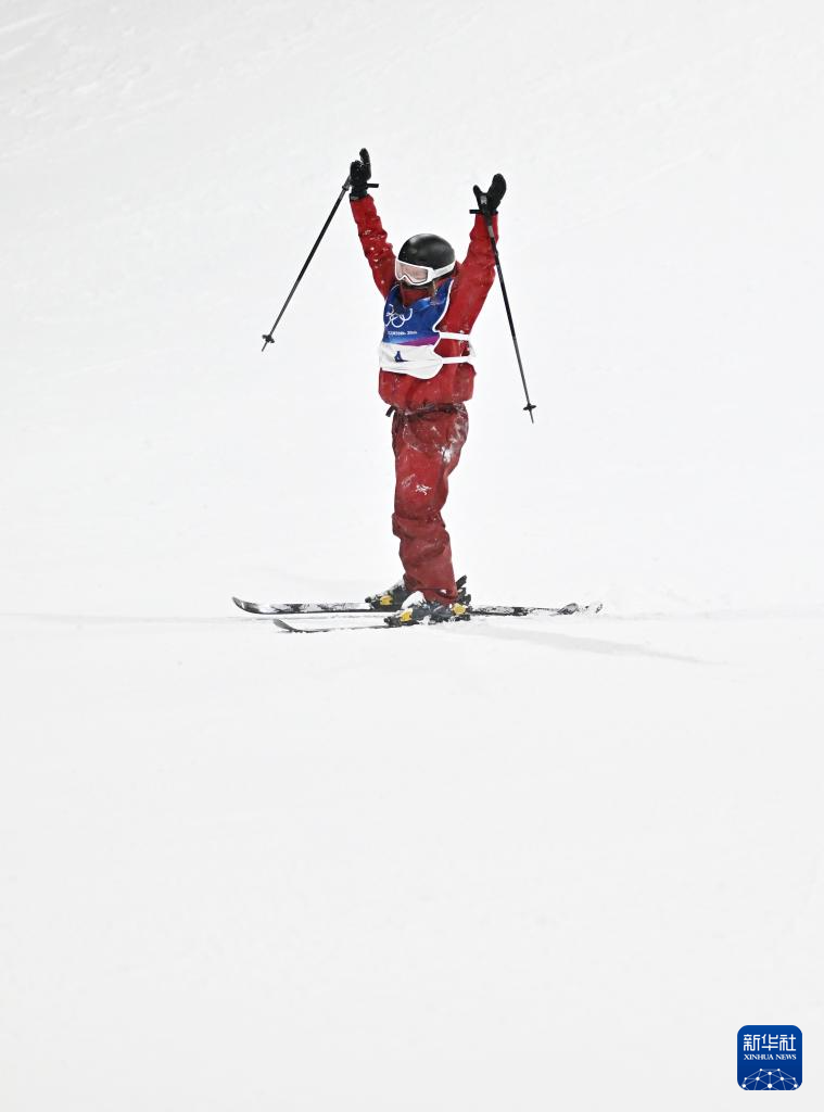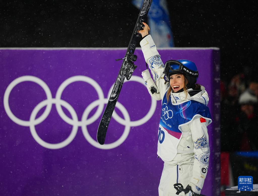 2月16日,中国选手谷爱凌在第三跳后庆祝。