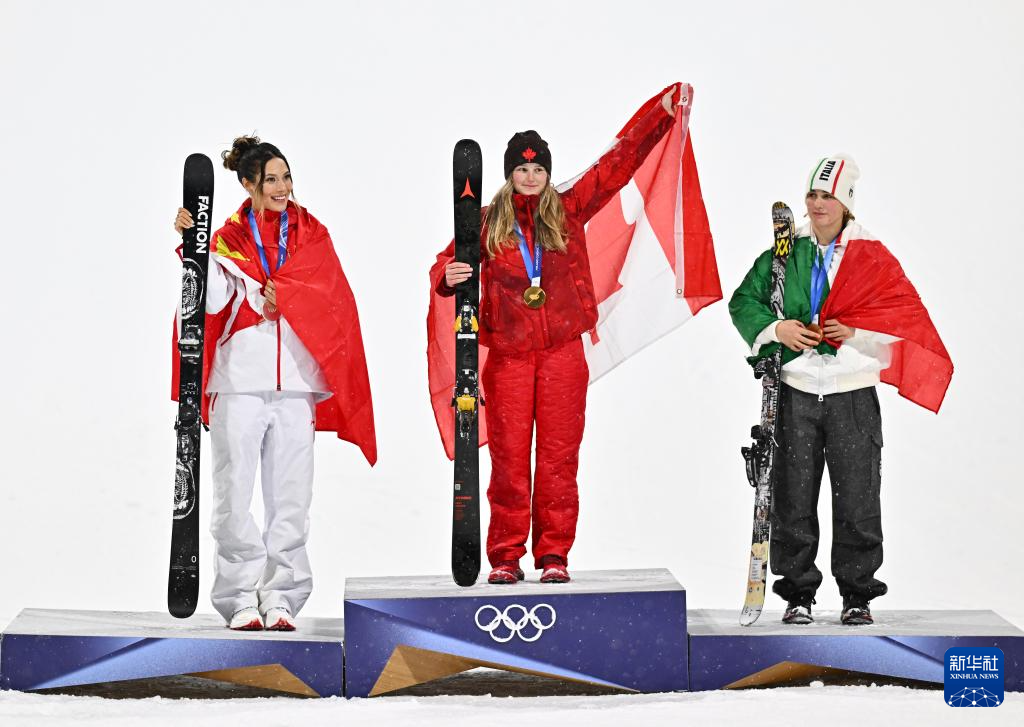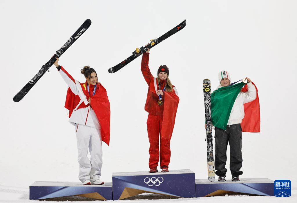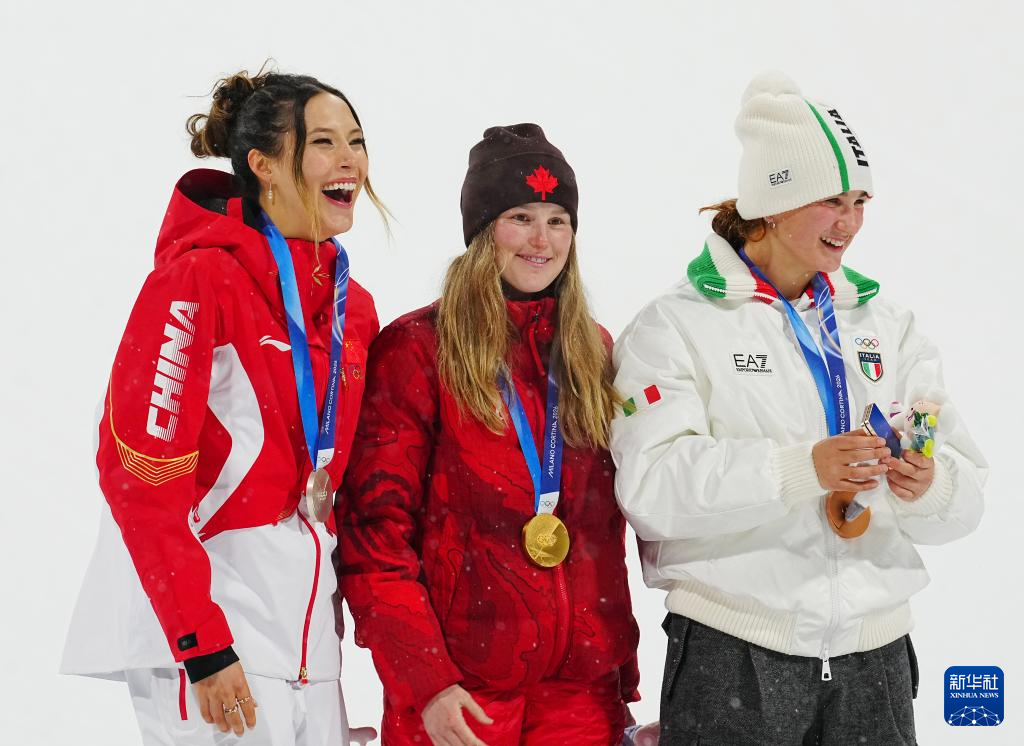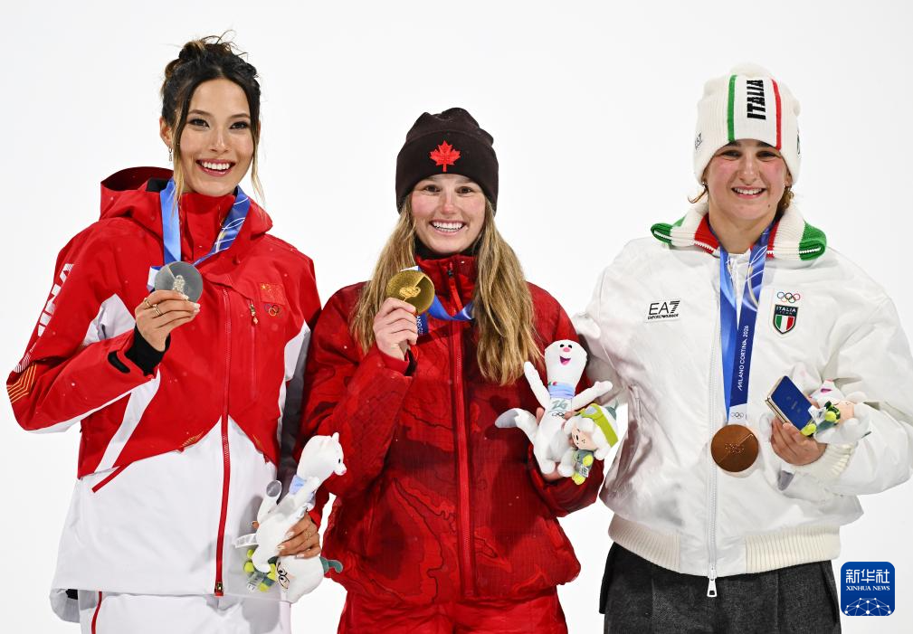 2月16日,冠军加拿大选手梅根·奥尔德姆(中)、亚军中国选手谷爱凌(左)、季军意大利选手弗洛拉·塔巴内利在颁奖仪式上。