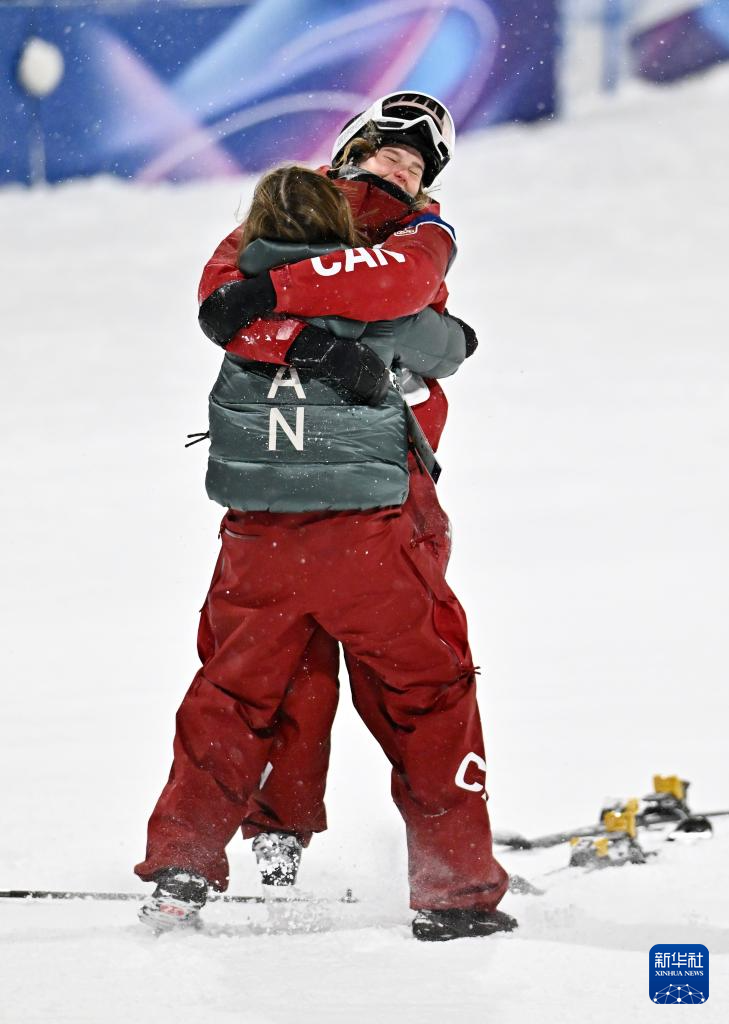2月16日,加拿大选手梅根·奥尔德姆(右)在比赛后拥抱队友。她获得冠军。