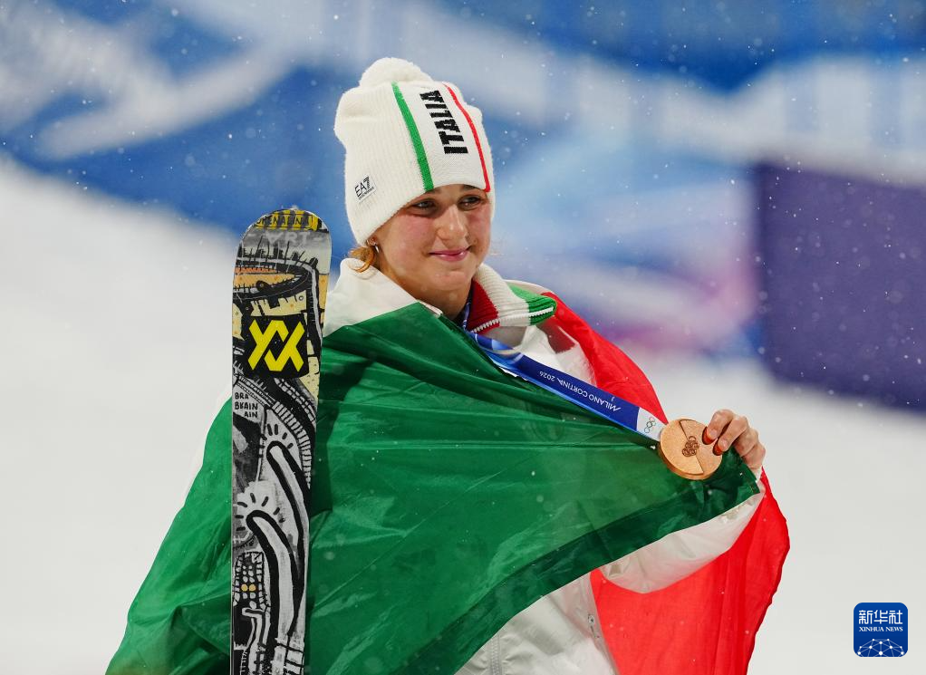 2月16日,意大利选手弗洛拉·塔巴内利在第三跳后庆祝。她获得季军。