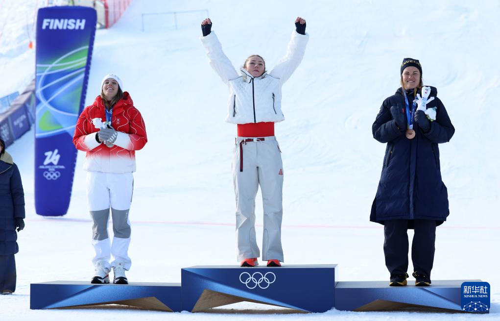 2月18日,冠军美国选手希夫林(中)、亚军瑞士选手拉斯特(左)和季军瑞典选手斯文·拉尔松在颁奖仪式上合影。
