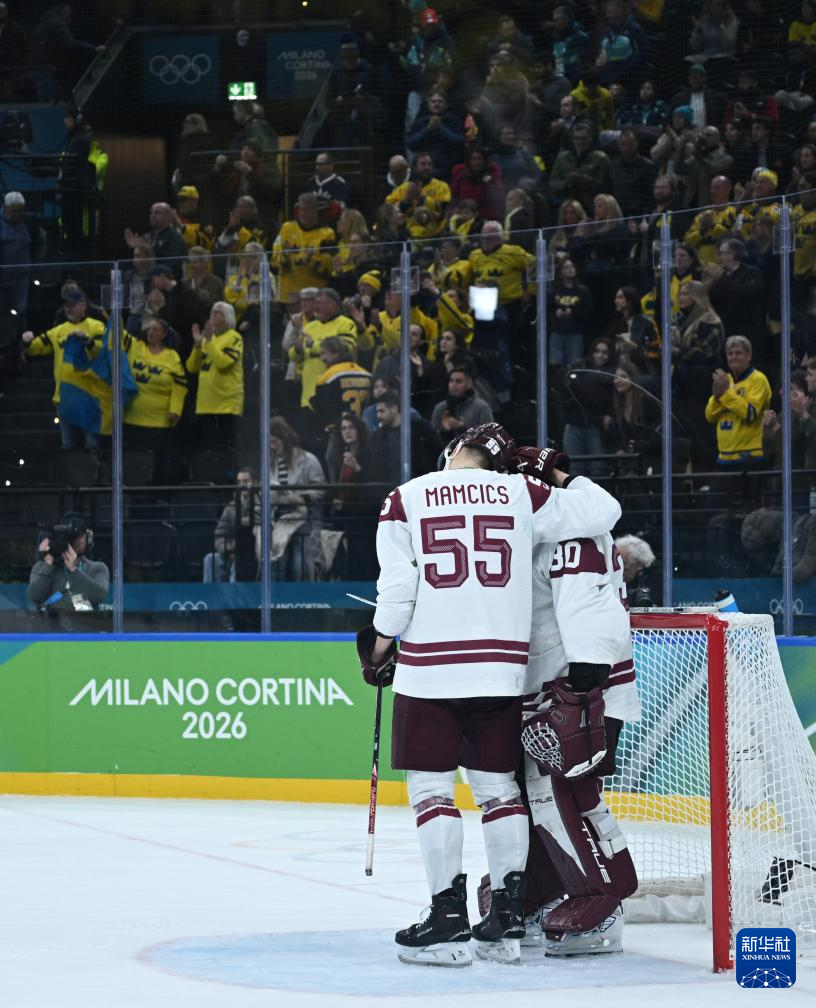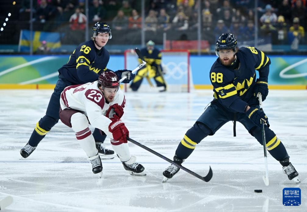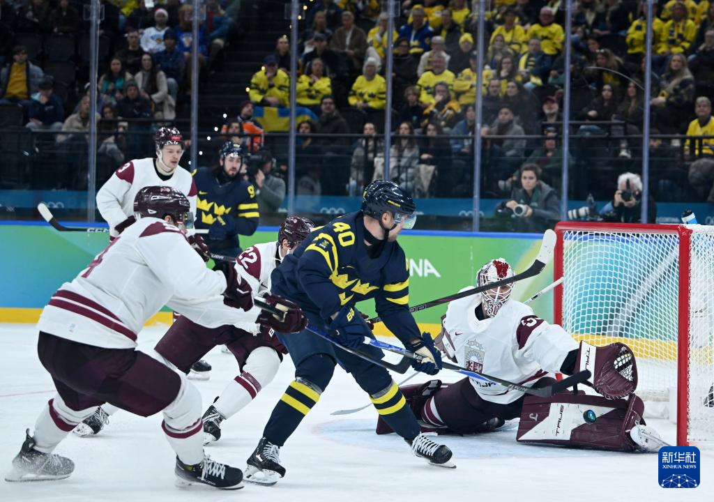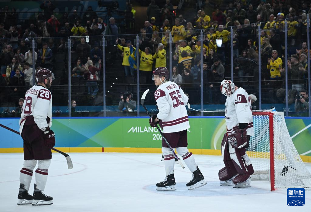 当地时间2月17日,在意大利米兰举行的米兰-科尔蒂纳冬奥会冰球项目男子资格附加赛中,瑞典队5比1战胜拉脱维亚队。