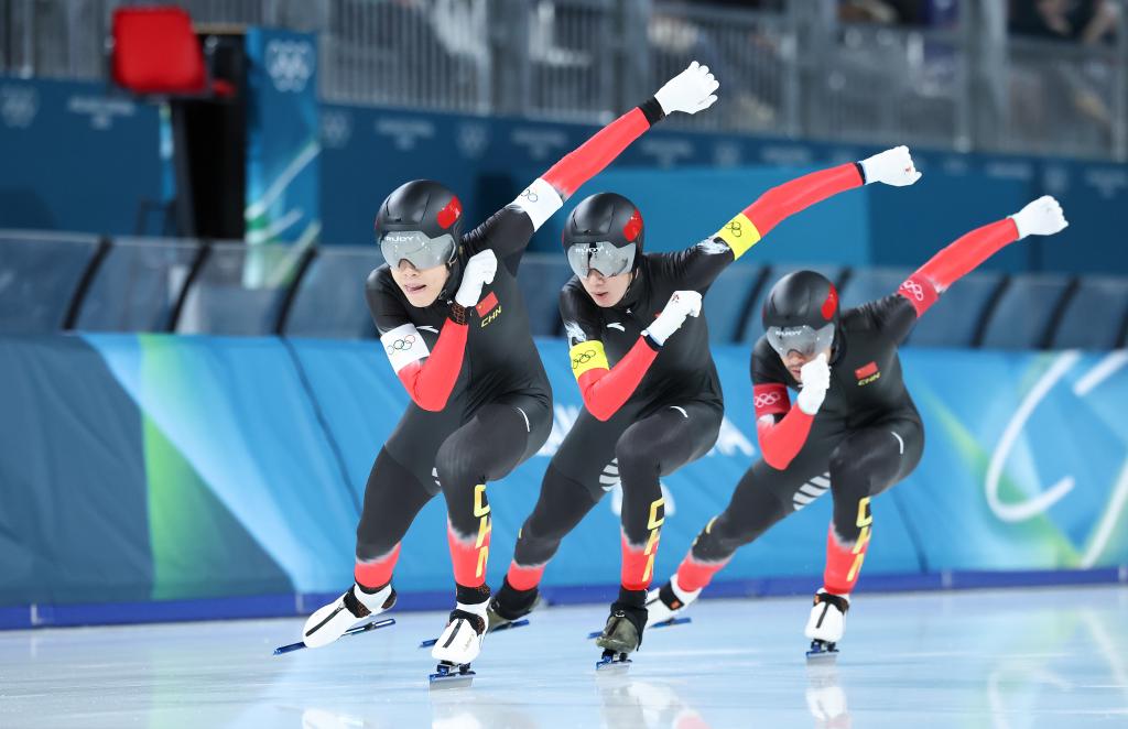 2月17日,中国队选手刘瀚彬、吴宇、李文淏(从左至右)在速度滑冰男子团体追逐B组决赛中。新华社记者 李京 摄