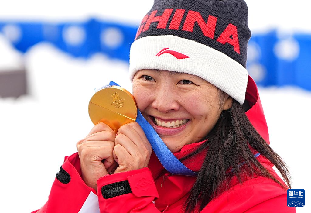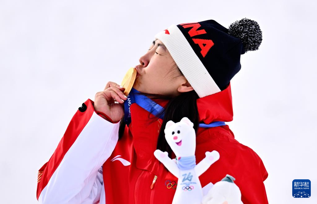 2月18日,中国选手徐梦桃在颁奖仪式上亲吻金牌。