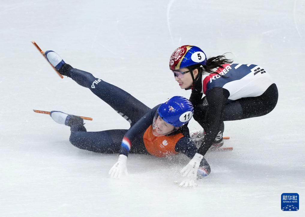 2月18日,韩国队选手金吉莉(右)率先撞线后庆祝。