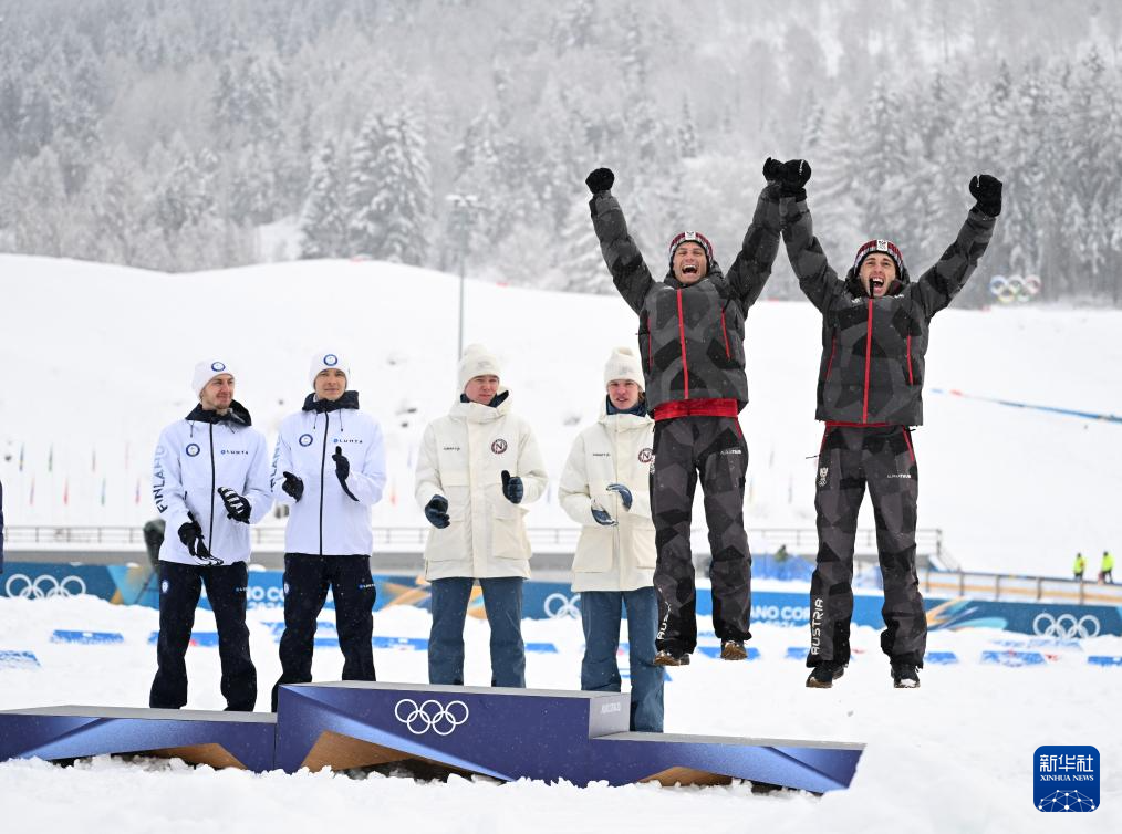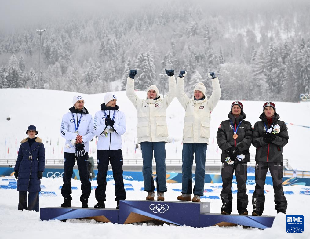 2月19日,冠军挪威队选手奥夫特布罗(右四)与斯科格隆(右三)、亚军芬兰队选手海罗拉(左二)与希尔沃宁(左一)、季军奥地利队选手兰帕特尔(右一)与雷滕格(右二)在颁奖仪式上。