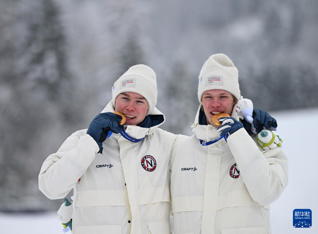 2月19日,冠军挪威队选手奥夫特布罗(左)与斯科格隆在颁奖仪式上咬奖牌庆祝。