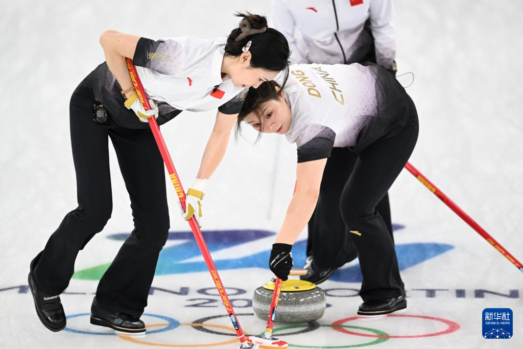 2月19日,中国队选手王芮(下)在比赛中掷壶。