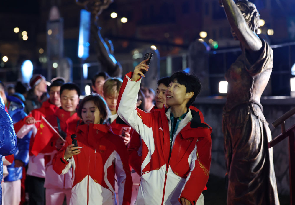 ↑中国自由式滑雪运动员齐广璞(中)在闭幕式入场。