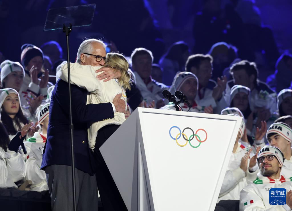 2月22日,国际奥委会主席考文垂(右)和米兰-科尔蒂纳冬奥会组委会主席乔瓦尼·马拉戈在闭幕式上拥抱。