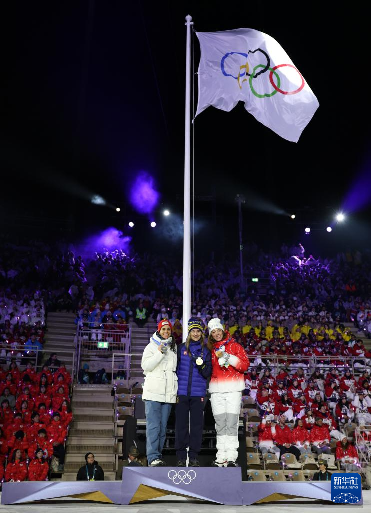 2月22日,越野滑雪女子50公里集体出发(传统技术)冠军瑞典选手安德松(中)、亚军挪威选手文格(左)和季军瑞士选手凯林在闭幕式现场举行的颁奖仪式上。